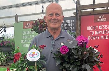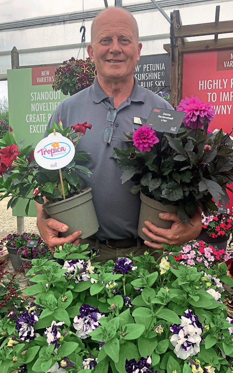 Stuart Lowen with Dahlia Gardenetta Lilac, Mandevilla Jade Scarlet and, in the foreground, Petunia SweetSunshine Blue Sky
