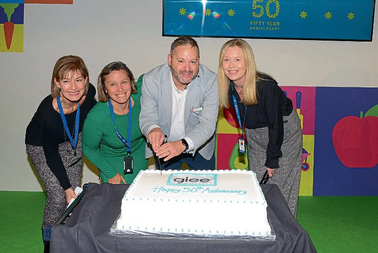 Above:The NECrecognised the 50th anniversaryofGlee by presenting MatthewMein with agigantic cake. All but the first twoGlee eventshavebeen held at the NEC. Matthewisseenherewith members of the NECteam.