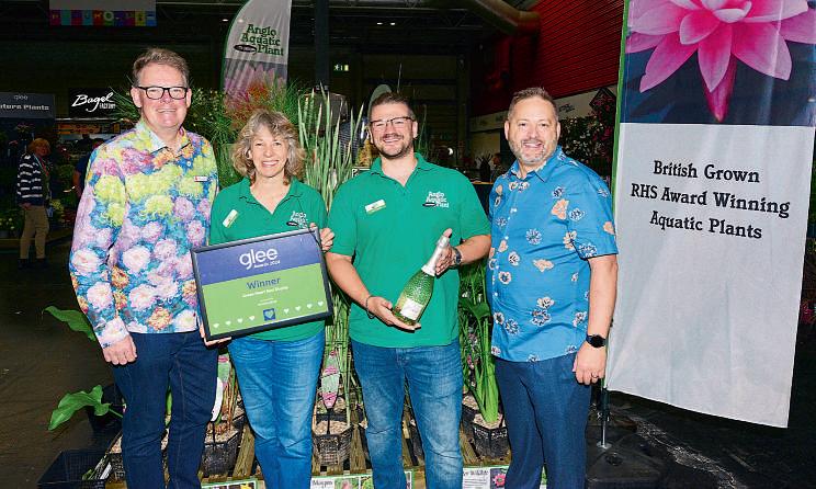 Below: Congratulations to AngloAquatic Plant which scooped the prizefor the Best Stand in the plant-focused Green Heartarea. Caroline Everett and DannySheenan,fromthe nurseryinMiddlesex, received awardfromBoydJ DouglasDavis and MatthewMein. Thestand gave retailersideas on howtodisplayand makethe most of salesofaquatic plants.