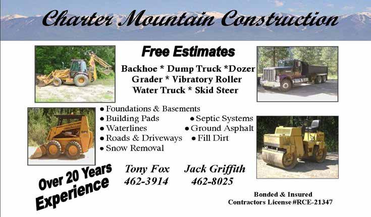 Boise County Guide -- May-June 2023 Issue 25 • DUMP TRUCK – BACKHOE – DOZERSKID STEER • Water Line & Electrical Trenching • Foundations & Basemmentts • Pad Preppar ation • Tree & Stump Removal • Roads & Driveways • Residential l Excavating • Snow Removal • Lot Clearing • Sand & Gr avel • Fill Dir t CONTACT: Paul Felty CELL#: 208-830-8786 EMAIL: dukecowboy@yahoo.com LET’ER BUCK EXCAVATION Lowman