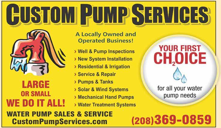 Boise County Guide -- May-June 2023 Issue 51 Garden Valley - Services B & W Fuels, Inc. 1900 N. Washington • Emmett, ID 83617 • Unleaded and Premium Gasolines • Clear Premium #2 Diesel • Dyed Premium #2 Diesel • #1 Stove Oil & #2 Furnace Oil • Motor and Hydraulic Oil DEPENDABLE WEEKLY DELIVERY COMPETITIVE PRICES (208)365-2291 • 55 Gallon Drums • 5 Gallon Buckets • Gallon Jugs (by the case) • Quart Bottles (by the case) SALES • SERVICE • INSTALLATION Residential Water Systems • Agricultural Center Pivot Line • Pumps • Tanks • Wheel & Handlines • Gated Pipe • PVC • Culverts • Water Well Drilling! Professional Response & Personal Service 608 N. Washington • Emmett, Idaho 1-800-246-2972 362-4290/283-5838 Boise County Guide Ben, Mike & Rochelle Fowler