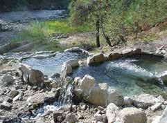 Take your choice of trails from Boiling Springs upriver. Two separate springs flow down the banks of a creek just above the river into a pair of scenic soakers spaced 50 yards apart along the tree-studded canyon. Both get swamped during high water, so fall is an ideal time go visit these spots. One trail, steep and slippery in spots, hugs the west side of the river all the way. This is the safer route during high water. The Middle Fork Trail is more direct, but you’ll have to ford several times in the 2-mile hike upstream. When you reach Dash Creek, the first side stream on the west side, you’ll find Moondipper 30 yards up the creek against a rocky bank. The large, sandy-bottomed pool can hold several happy soakers and offers a great view up the canyon. Pine Burl, a gem tucked out of sight a few bends up the creek, has a pool roughly 7 to 8 feet in diameter. The name, once inscribed on a small masonry dam at the downstream end, has eroded away, but the inspiration for it still sits up the hill on the north side. The spring perks up through the sandy bottom, and if the water gets too hot, you can shift the rocks at the other end to let creek water trickle in.