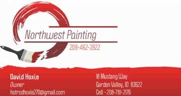 58 -- Boise County Guide - May-June 2023 Issue Garden Valley - Services/Construction 20+ Years of Experience in Boise County Area • Free Estimates • New Home Painting • Re-Paints • Exteriors • Interiors • Deck Refinishing • Rails • Stairs • Log Cabin Refurbishment • Stain and/or Oils • Cabinet Facelifts Cell 208-781-2176 • hotrodhoxie270@gmail.com 208-462-3922 3rd generation of professional painting