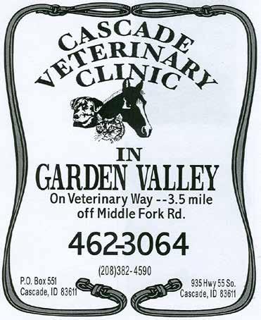 Boise County Guide -- May-June 2023 Issue 43 Thunder Hill Fitness Tierney -- 484-1091 Mary Jo -- 954-0121 OPEN 7 DAYS a WEEK 5 am - 10 pm • PartneredwithSilverandFit • Reimbursementfromsome insuranceplans Yoga • Certified Personal Trainer • Tanning • Boot Camp Everything is a personal approach. Monthly Plans & Day Passes Available. 283 S. Middlefork Rd. GV, ID New Ownership Garden Valley - Services Puppy Swagger All Breed Dog Grooming by Monica Hunter Monday - Friday by Appointment Only..... Bath & Brush De-shedding Nail Trims Full Service Haircut Grooming Crouch Next to the Senior Center 208-509-0778 P.O. Box 551 Cascade, ID 83611 935 Hwy 55 Cascade, ID 83611 (208)382-4590 www.cascadevetclinicidaho.com 462-3064