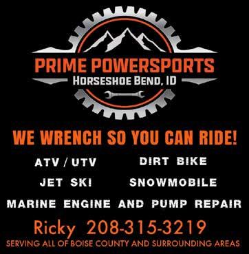 Boise County Guide -- May-June 2023 Issue 55 Side by Sides • Fat E-bikes • Kayaks www.gardenvalleyrents.com 208-462-0855 Garden Valley - Services The Sprinkler Exchange Remove and Replace your sprinkler heads! We have all brands in stock to replace your broken sprinkler head. Your system will receive a pressure test to get your best results. 208-284-5710 Please Call at: