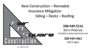 Boise County Guide -- May-June 2023 Issue 65 EWJ Replacement Window Specialist Serving all of Idaho • Siding • Windows • Remodels • 33 years Experience 208-629-4203 mather208@msn.com 87 Atlanta Rd. Atlanta, ID 83601 Licensed and Insured RTC# 42233 “Guaranteed Like Your Grandfather’s Hand Shake.” Now Offering Seamless Gutters and Chimney Sweeping Serving Garden Valley Since 1997 Peter Lang (208)830-5643 Lic. No. RCE-34113 Ol Langer’s Exteriors LLC F R AMING• ROOFING• SID I N G FRAMING ROOFING SIDING Garden Valley - Construction