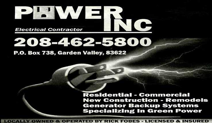 All Metals ............................................... 208-398-9727 Ambulance -- Garden Valley F.D. ...... 1-800-632-8000 Avimor Clinic, GV Family Medicine 208-801-4282 B & W Fuels, Inc. 365-2291 BackDraft Beer Truck ............................ 208-284-5710 Berg Plumbing .............................................. 899-9404 BoCo Social .................................................. 392-9334 Boise County Guide - Ben Fowler 362-4290 Books in the Attic 462-2305 Cascade Refrigeration - Heating & AC ......... 781-0061 Cascade Veterinary Clinic ............ 462-3064/382-4590 Charter Mountain Construction 462-3914 Clark’s Concrete Construction 462-5317 CMS Concrete & Construction 860-4865 Coats Construction Concepts ................ 509-552-2051 CowboyCampground.com ..................... 208-362-4343 Cranberryhill Studio ............................... 970-376-0027 Custom Pump Services 369-0859 Davis & Walker Law Office 462-6388 Elkview Homes .............. 208-510-7371/208-501-9035 ERA West Wind Real Estate - Ilene Johnson & Jackie Kraupp 462-3250 EWJ Construction 629-4203 Exceed Legal ................................................ 297-5959 5 Star Cleaning ............................................. 954-7459 Fackrell Masonry & Constructiion 844-406-2766 Fair-N-Square Construction 949-5216/949-1063 GV Center for the Arts .................................. 462-6860 GV Chamber of Commerce .......................... 462-5003 GV Chevron 462-3869 GV Community Radio 462-4350 GV Counseling 462-2762 GV Family Medicine, PC .............. 462-3533/793-2257 GV Homes & Land Real Estate, Val Jones .. 462-6102 GV Fire Department 462-3175 GV Insurance 462-3000 GV Library 462-3317 GV Market ................................................... `462-3817 GV Motel....................................................... 462-2911 GV Post Office .............................................. 462-6029 GV Properties 462-4620 GV Ranger Station 462-3241 GV Rents 462-0855 GV Schools................................................... 462-3756 GV Senior Center ......................................... 462-3943 GV Septic 462-5578 Gentry’s Outpost Come and Say Hi! Goff’s Plumbing & Septic 365-4257 Harrison Plumbing ................................. 208-941-2879 Haven Hot Springs Resort ..................... 208-793-0630 Heartland Dirtworks 208-315-1330 Hidden Pearl B&B & Venue 986-888-0869 Hinge Wine Cellar Come See Us! Home Boutique ...................................... 208-392-5223 Home Loans, Lynette Hjerpe ................. 530-681-6067 Horseshoe Bend Chamber of Commerce 793-2219 Horseshoe Bend Clinic/GV Family Medicine 793-2257 Horseshoe Bend Library 793-2460 Horseshoe Bend Post Office ........................ 793-2714 Horseshoe Bend School ............................... 793-2225 Horseshoe Bend Senior Center.................... 793-2344 Huckle & Sage 793-2541 Idaho City Chamber of Commerce 392-4159 Idaho City Grocery........................................ 392-4426 Idaho City Library ......................................... 392-4558 Idaho City Offices 392-4584 Idaho City Post Office 392-4512 Idaho City Ranger Station 392-6681 Idaho City School ......................................... 392-6631 IIdaho City Senior Center ............................. 392-4918 Idaho City Visitors Center .............................. 392-6040
