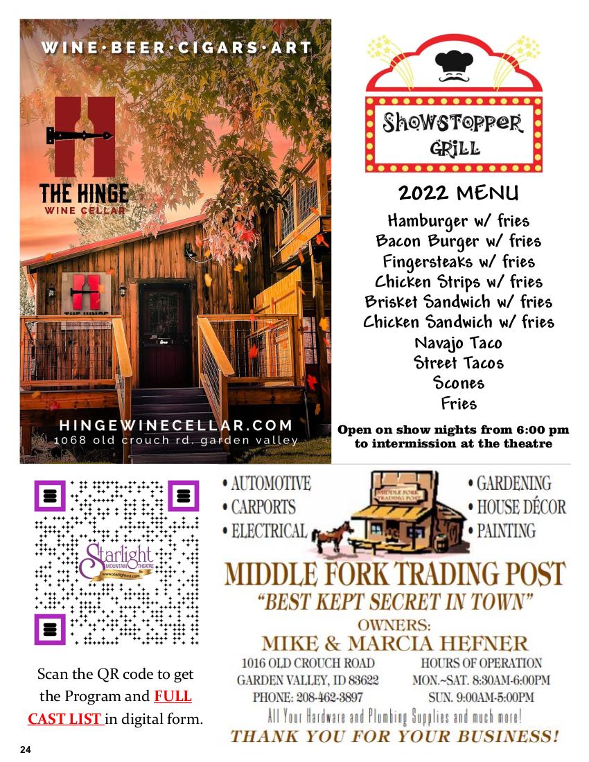 Starlight Mountain Theatre is excited to announce our upcoming season of Broadway Musicals Under the Stars! Opening May 26th! For information on ticket prices, show dates, RV/Camping and more, please go to www.starlightmt.com, or call our Box Office at 208-462-5523 Located on the banks of the Payette River, Starlight invites you to reserve your tickets now, and come join us for another incredible season of high quality, family-friendly entertainment!
