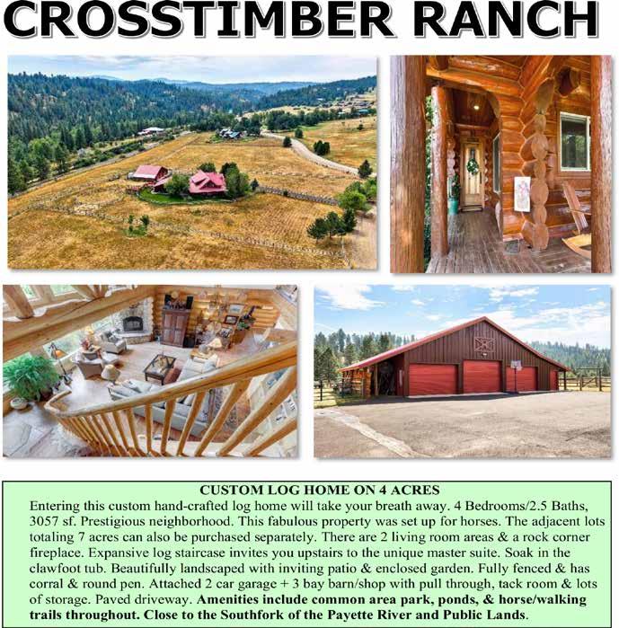 16 -- Boise County Guide - May-June 2023 Issue Idaho City - Real Estate BOISE COUNTY HOMES 12 Coyote Point 24 55-acre equestrian dream property w/exceptional Payette River views! 60x180 barn with screened indoor riding arena 2,032 sq ft of attached, 5 car insulated/heated garage/shop space for the car & toy enthusiast
