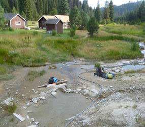 In plain view below the highway, these popular pools are frequently filled with people. 4.3 miles east of Lowman on State Hwy 21. Cross the bridge to Kirkham Campground and park at the west end. The Forest Service collects a day-use fee. Large pools with moderate temperatures. Worth trying either during the early mornings or early spring, when congestion in the campground and number of users is at a low point.