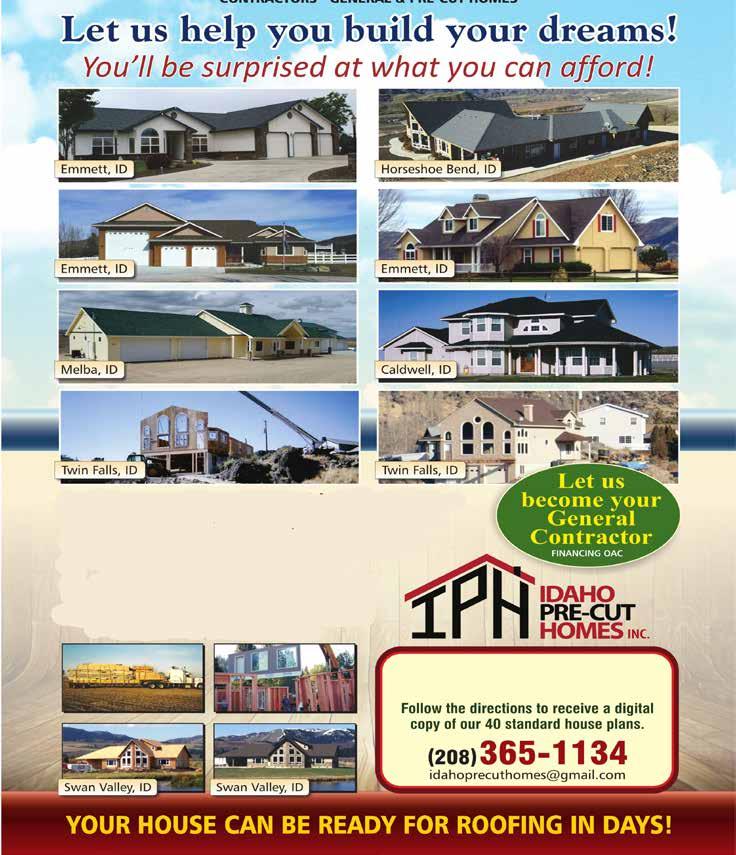 62 -- Boise County Guide - May-June 2024 Issue Idaho City, ID Idaho City, ID Horseshoe Bend, ID Twin Falls, ID Garden Valley, ID McCall, ID Caldwell, ID Twin Falls, ID Let Coats Construction Concepts become your General Contractor FINANCING OAC Swan Valley, ID Swan Valley, ID Coats Construction Concepts LLC Faster Construction, More Affordable and High Quality Garden Valley, Crouch, Idaho City and Cascade Turn-key Construction/Owner Builder Programs Idaho Contractor’s License number RCE- 61642 Authorized distributors for: Idaho Pre-Cut Homes, Inc. Visit our web site: www.idahoprecuthomes.net and click on the box ‘Order Our Design Package’ Garden Valley - Services/Construction