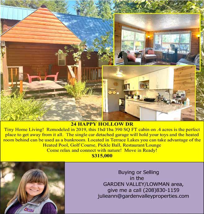 Boise County Guide -- Winter 2022-2023 Issue 77 Mary VIS FOR ALL YOUR REAL ESTATE NEEDS Garden Valley Homeowner and Local Real Estate Professional SPECIALIZING IN: 2nd Home Properties Investment Properties 1031 Exchanges 208-631-3999 idahorealestatebiz@gmail.com idahorealestatebiz.com teamrealtyofidaho.com Garden Valley Memory Flea Market & Silent Auction CROUCH COMMUNITY HALL In the Center of Everything!! Nov 19-20 Dec 17-18 10am - 4pm Each Day • Sponsored by Michelle’s Free Rides • Garden Valley - Retail/Real Estate Call Mike for more information 208-462-5070