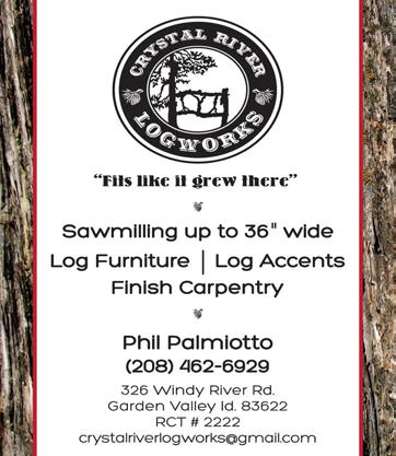 Boise County Guide -- Winter 2022-2023 Issue 65 Log Furniture • Log Accents Finish Carpentry Sawmilling up to 36” wide Servicing Boise County • Valley County • Treasure Valley Locally Family Owned & Operated “We don’t want to kill all the pests......just yours!” Licensed • Experienced 373-4722 P.O. Box 340 - Garden Valley, ID 83622 Snow Removal Available! MANTIS PEST CONTROL LLC 20+ Years Experience • Treating landscapes & structures • Commercial & residential • Weed, insect & plant disease control • Spider barriers • Aquatic weed control • Tree injections • Rodent control & more! • Fertilizer options available Owner Operated w/ degrees in Wildlife Management & Plant Science Call for a free estimate: 208-954-9305 Serving Boise, Gem & Valley Counties BOISE CO GUIDE 1/8 PG - $50 1/4 PG - $60 1/2 PG - $100 FULL PG - $175 Per IssueRATES ASK US FIRST! One Call Does It All “No Job too small • We do it All” Home Construction Home Maintenance & Repair All phases of Construction Framing to Finish, Plumbing, Elec, & more Decks, Roofing Log Work too. Stairs, Handrails, Furniture We Build THEM ALL So Give Us A Call and ASK US FIRST! 30 Years Experience David Martens Lic. # RCT-9750 462-3956 Garden Valley - Services/Construction