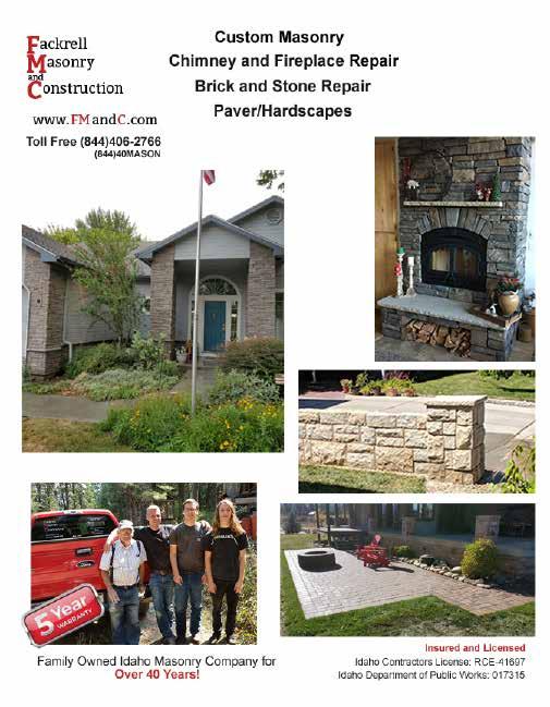 Boise County Guide -- Winter 2022-2023 Issue 67 WWW.CMHGV.COM 851 BANKS LOWMAN RD GARDEN VALLEY, ID 83622 CASTLE MOUNTAIN HOMES 208-462-2882 Remodel Specialist Interior • Interior Renovations • Kitchen and Bathroom Remodels • Wood and Metal Stud Framing • Doors and Windows • Flooring Carpet, Laminate, Wood, Vinyl, Tile • Drywall. Texture, and painting Exterior • General Construction • Concrete • Waterproofing/Sealing • Framing and Structural Repairs • Doors and Windows • Dry Rot Repairs • Siding Whatever the Disaster, We Answer!! CMH is a full construction and restoration company capable of handling projects of all types and sizes. Let us help you through the process. Garden Valley - Services/Construction