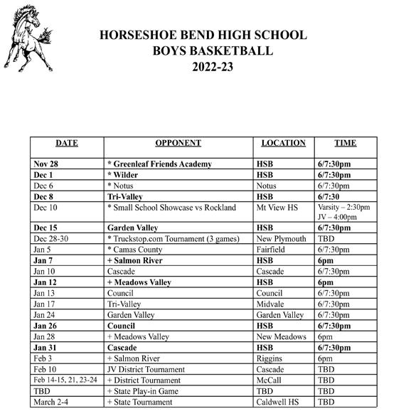 28 -- Boise County Guide - Winter 2022-2023 Issue Horseshoe Bend Mustangs Boys Basketball 2022-23 Schedule MUSTANG BASKETBALL Horseshoe Bend