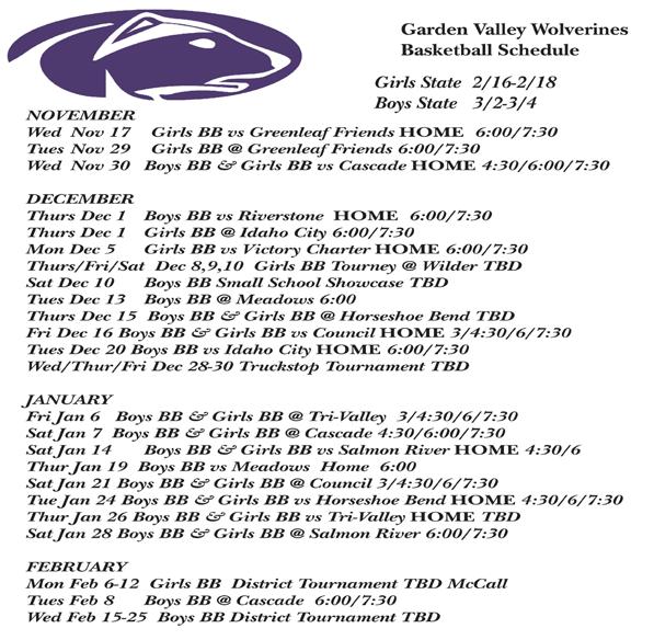 Boise County Guide -- Winter 2022-2023 Issue 103 Garden Valley Basketball 2022-23 Schedule WOLVERINE BASKET BALL Garden Valley
