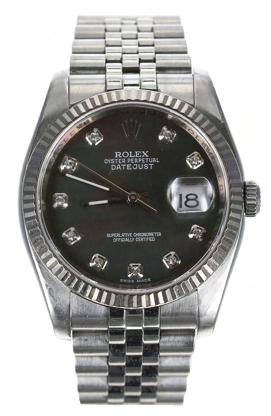 Rolex Oyster Perpetual Datejust 36 stainless steel gentleman's wristwatch, reference no. 116234, serial no. M04xxxx, circa 2007, white gold fluted bezel, mother of pearl dial with diamond hour baton markers, roulette date wheel and sweep centre seconds, jubilee bracelet, 36mm