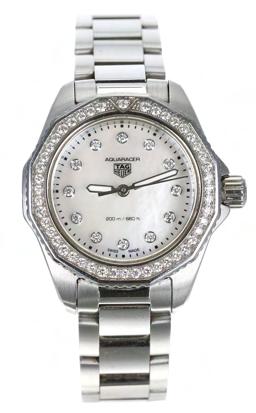 Tag Heuer Aquaracer stainless steel lady's wristwatch, reference no. WBP1417-0, serial no. BRV3xxx, mother of pearl dial with diamond markers, diamond set rotating bezel, Tag Heuer bracelet with folding clasp, quartz, 30mm bezel