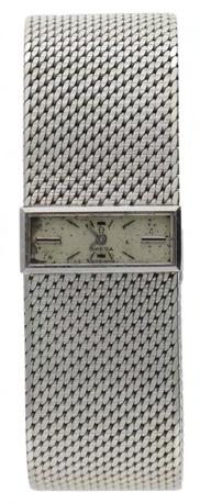Vintage Omega 18ct white gold lady's wristwatch, reference no. 711.109, with a narrow rectangular silvered dial, with a back-wind crown, integral mesh link bracelet with safety chain, 73.7gm, 21mm
