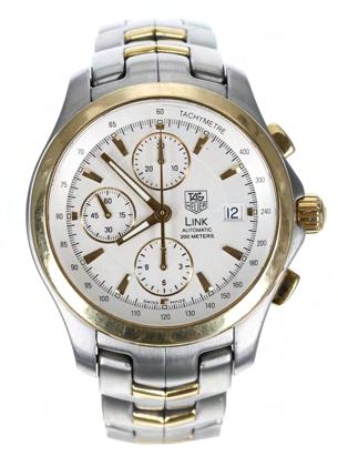 Tag Heuer Link Chronograph automatic stainless steel and gold gentleman's wristwatch, reference no. CJF2150, serial no. RRE0xxx, silvered dial, Tag Heuer bracelet with signed fliplock clasp, 41mm bezel