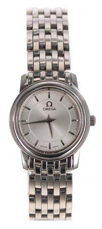 Omega De Ville lady's stainless steel wristwatch, serial no. 5784xxxx, circa 1999, silvered dial, stainless steel Omega bracelet with folding clasp, quartz, 22mm