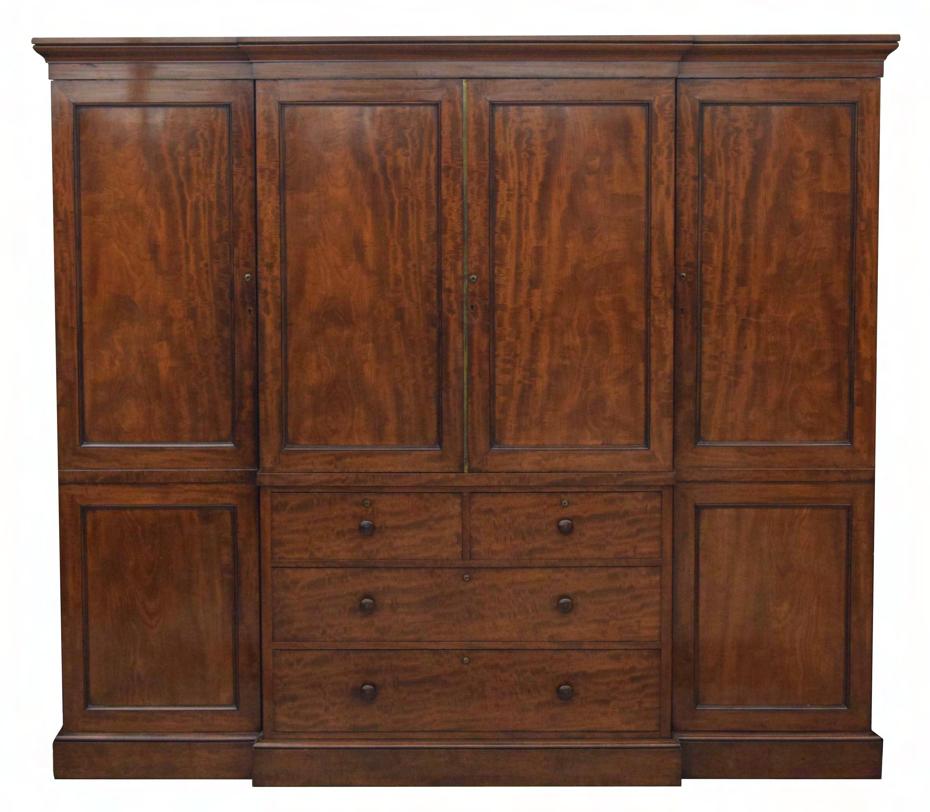 Fine and impressive Victorian mahogany breakfront wardrobe, the stepped cornice over a central pair of panelled doors enclosing five slides, on a base section of two short over two long graduated drawers, this flanked by two long panelled doors enclosing hanging rails, raised on a plinth base, bears the label for Wm Richardson Ltd. House & Office Furnishers, Leeds & Bradford, 100" wide, 26" deep, 88" high £1500-2500