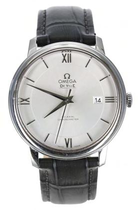 Omega De Ville Prestige Co-Axial Chronometer automatic stainless steel gentleman's wristwatch, reference no. 42413402002001, serial no. 86871xxx, circa 2014, silvered dial, modern black leather strap, 39.5mm