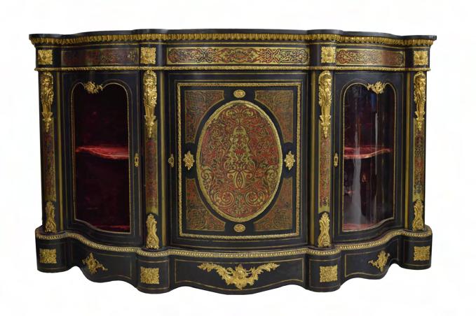 Impressive Victorian ebonised tortoiseshell boulle work serpentine credenza, with inlaid frieze panels over a central panelled door flanked by two serpentine doors (one lacking glass) enclosing baize lined shelved interiors, with gilt mask mounts, all raised on a plinth base, 83" wide, 22" deep, 47" high
