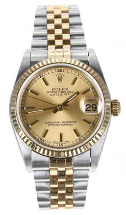 Rolex Oyster Perpetual Datejust gold and stainless steel mid-size wristwatch, reference no. 78273, serial no. K849xxx, circa 2001, gold fluted bezel, champagne dial with applied gilt hour baton markers, minute markers, sweep centre seconds and date aperture, jubilee bracelet with flip clasp, 30mm