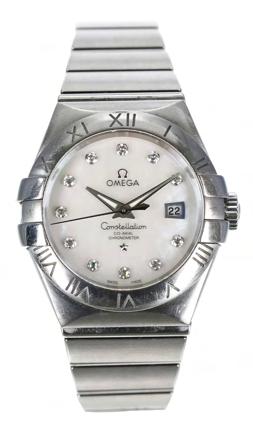 Omega Constellation Co-Axial Chronometer automatic stainless steel lady's wristwatch, reference no. 12310312055001, serial no. 85145xxx, circa 2011, mother of pearl dial with diamond markers, Roman numeral bezel, cal. 8520 28 jewel movement, exhibition case, Omega bracelet with signed butterfly clasp, 31mm