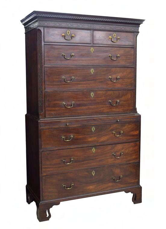 Good George III mahogany chest on chest, the carved dentil cornice and blind fret frieze, over two short and three graduated long drawers, the base with a pull-out slide over three drawers and upon pierced bracket feet, 44" wide, 22" deep, 73" high £500-800