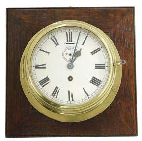Interesting British ship's bulkhead wall clock with a WWII German Navy 6" silvered dial engraved with the Nazi eagle logo over a capital M and inscribed 441N/G, within a blackened metal case inscribed verso Grimshaw Baxter Elliott (German Navy clock winding key)