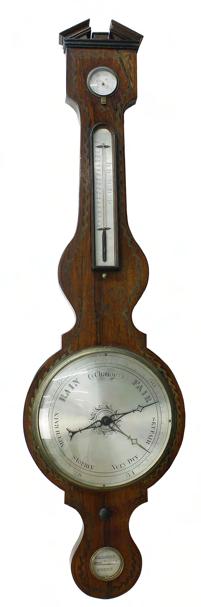 Good wheel barometer/thermometer, the 8" silvered dial signed F. Pastorelli & Co, 208, Piccadilly, London, within a shaped case carved with C-scroll sides; also another oak barometer/ thermometer, the 8" silvered dial signed Chadburns Ltd, Opticians, Liverpool, within a carved case with rounded scrolling cornice (2) £80-120