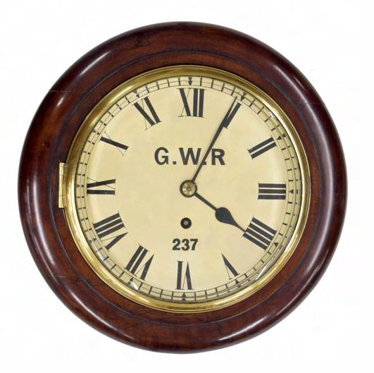 Mahogany single fusee 8" wall dial clock inscribed G.W.R, no. 237, within a turned surround (pendulum and key)