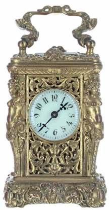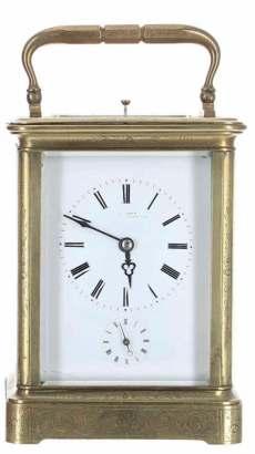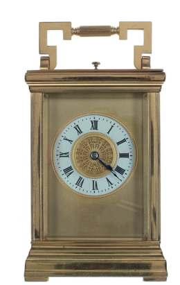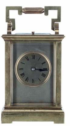 French carriage clock timepiece within a corniche brass case, 6" high; also a small French travelling alarm clock within a brass case, 6" high (2)