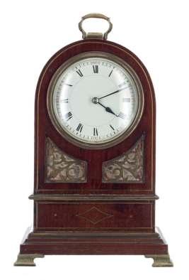 Eureka large balance wheel electric mantel clock no. 9430, the 4.5" cream dial over a brass support inscribed Patent no. 14614, 1906, Made in England, with fast/slow star control, within a lancet mahogany glazed case, 15" high £800£1200