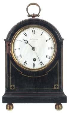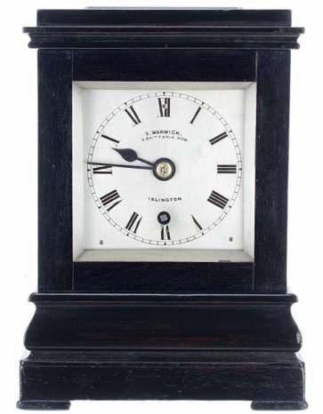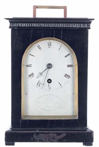 French V.A.P. ebonised and walnut small mantel clock, 6.5" high; also another ebonised V.A.P. mantel clock, brass drumhead timepiece and seven various old travelling clocks (10)