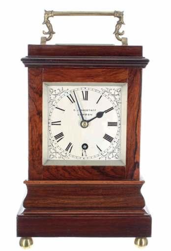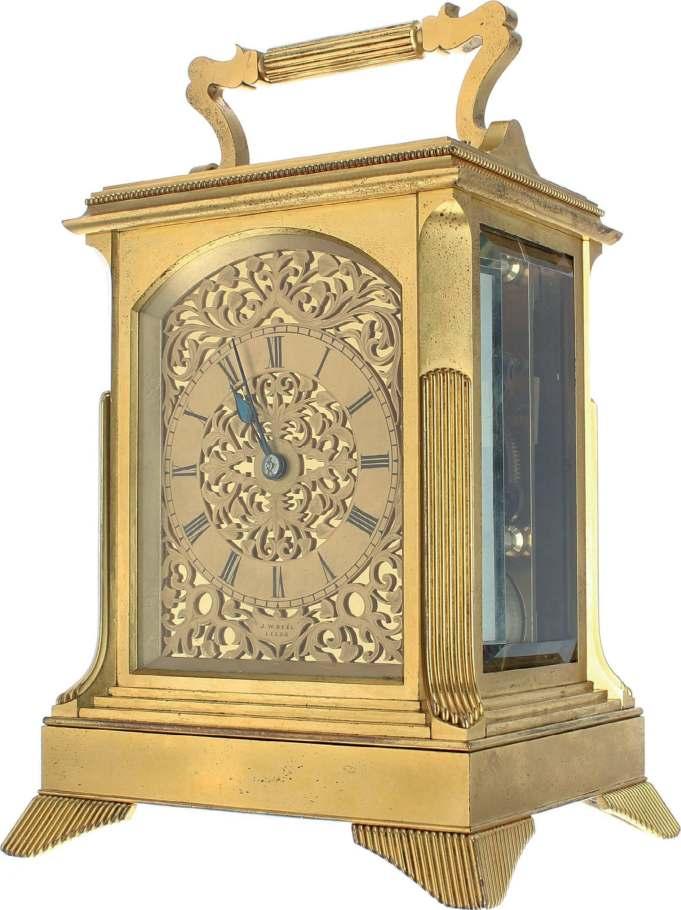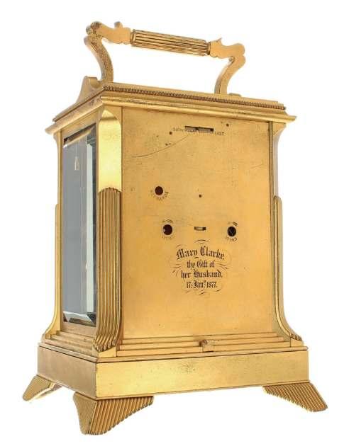 Repeater carriage clock, the movement back plate stamped Patent Surety Poller within an oval, also stamped Paris no. 3063, the dial inscribed Goldsmith's Company, 112 Regent Street, London W., Paris Made, within a stepped pillared case, 7.5" high