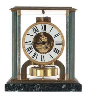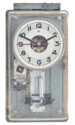 ATO industrial electric wall mounted master clock with unusual electromechanical mercury switch, the 7.5" silvered chapter ring enclosing a skeletonised centre and with centre seconds, mounted on a green marble metal plate and under a Plexiglass case, 20" high overall £250£350