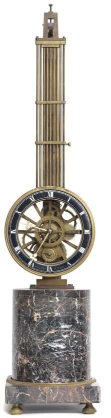 Bulle electric mantel clock, the 5.25" chapter ring enclosing a skeletonised centre, upon a cylindrical brass battery column, under a glass dome and upon a turned oak stepped base, 16" high overall £80£120