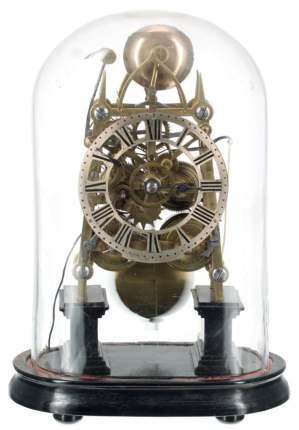 BulleClock electric mantel clock, the silvered chapter ring signed and inscribed O. Wehrle, Market Hill, Cambridge, enclosing a skeletonised centre and supported upon a cylindrical brass battery housing, under a glass dome and upon a mahogany turned base, 16.5" high overall
