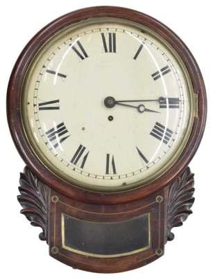 Mahogany single train 12" drop dial wall clock, within a turned surround over carved ears and a pendulum window (pendulum); also an oak 12" wall dial clock within a turned surround (pendulum) (2)