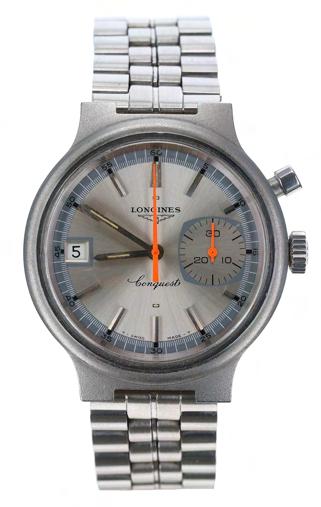Longines Conquest 'XX Olympic Games Munich 1972' single button chronograph stainless steel gentleman's wristwatch, reference no. 8613-1, serial no. 170xxx, circular silvered dial with applied baton markers, grey minute chapter with white seconds/minute markers and Arabic five minute divisions, subsidiary thirty minute recording dial with orange hand at the three position and date aperture at the nine position, orange chronograph centre seconds, Longines crown, Longines 'XX Olympic Games Munich 1972' case back, later stainless steel bracelet, 36mm