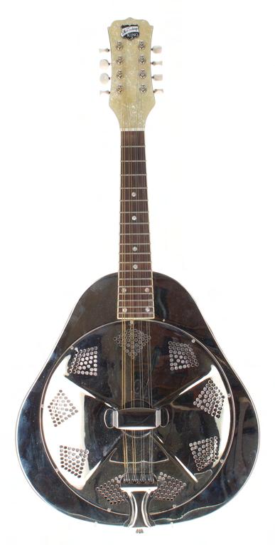 Recording King resonator mandolin with pear shaped body and mother of pearl overlaid headstock, semi-rigid case
