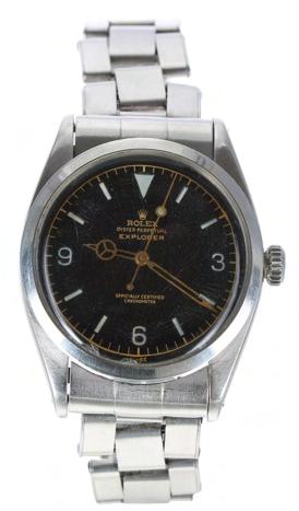 Rare Rolex Oyster Perpetual Explorer Super Precision stainless steel gentleman's wristwatch, reference no. 5500, serial no. 1215xxx, circa 1965, black gloss 'Swiss' gilt dial with double 'T ** Private provenance bequeathed to the present owner approximately 25 years ago by family descent £5000-8000