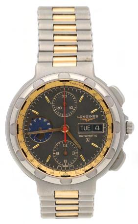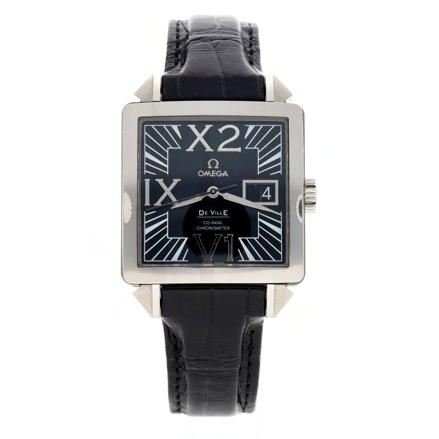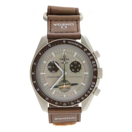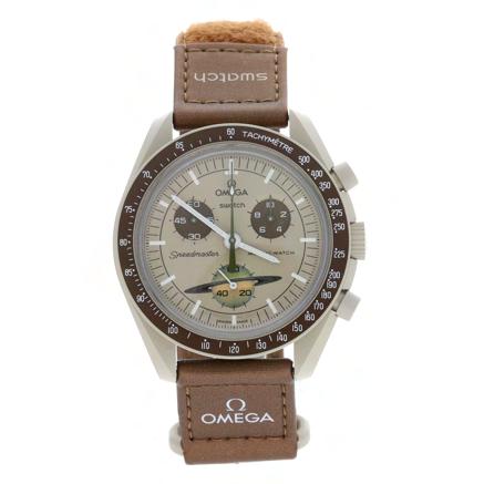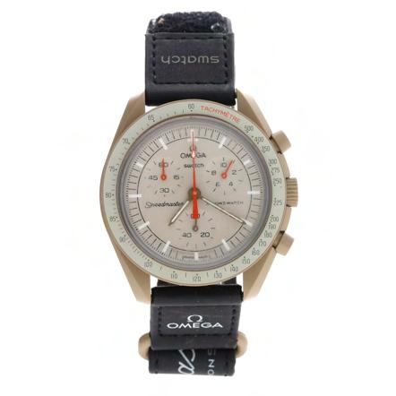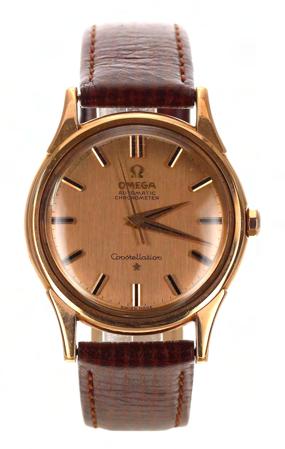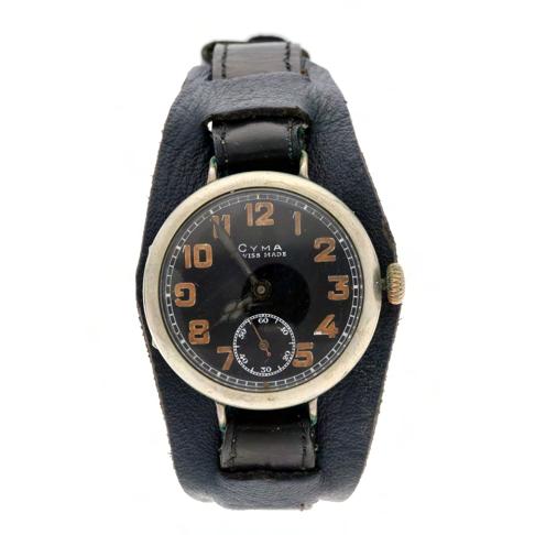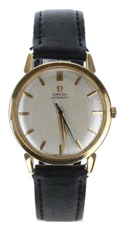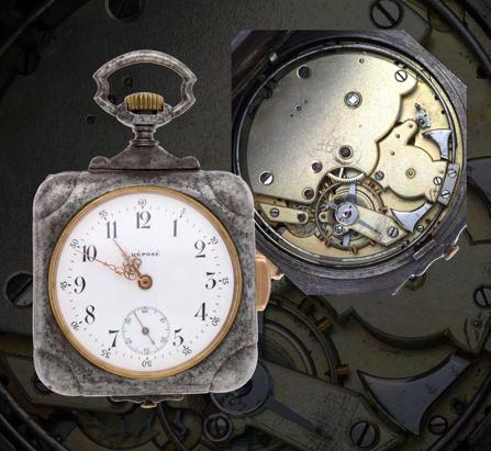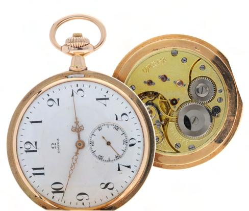 Omega Goliath gilded pocket watch set in a classical ormolu stand, modelled with a satyr and winged angel upon a rectangular base, the watch with a gilt frosted movement, compensated balance and regulator lever to the cock, the dial branded ' MM & Co. Patent', with bold Roman numerals, outer minute track and a subsidiary seconds dial, blued steel hands, set in re-gilded case, no. 1569xxx, 77mm, the stand 9.25" high