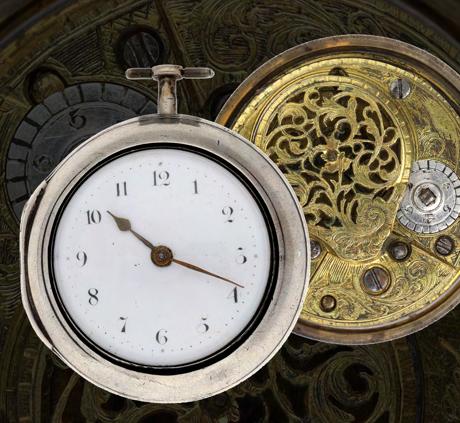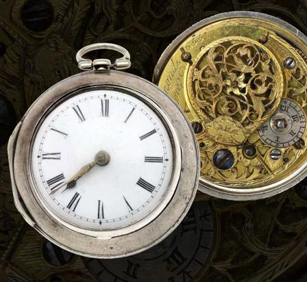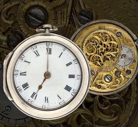 Jasper Harmar, London - English early 18th century silver pair cased verge pocket watch, circa 1700, signed deep full plate fusee movement with flat steel balance, finely pierced and engraved winged balance cock with broad foot, silvered regulating dial and tapered pillars, signed champlevé dial with a repoussé mask centre, Roman numerals and outer Arabic five minute chapter, pierced gilt hands, the inner case with 'H.G' makers stamp, the outer case with engraved decoration, 57mm ** Jasper Harmer, London circa 1685-1716