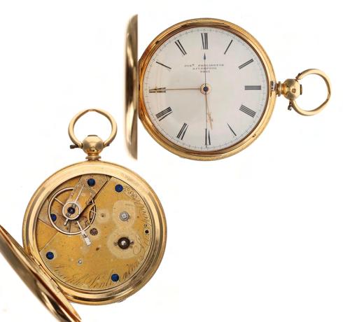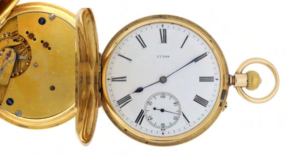 Baumgart - Swiss gold quarter repeating cylinder pocket watch, unsigned gilt frosted movement with gilt balance, regulator and hammers striking a gong, hinged cuvette signed 'Baumgart, 31 Gerrard Street, Soho', enamel dial branded 'A: Longchamp A Geneve', with Roman numerals and minute track, blued steel 'Breguet' type hands, within an engine turned case with repeat slide at the two position, 53.2gm, 45mm; with key and case