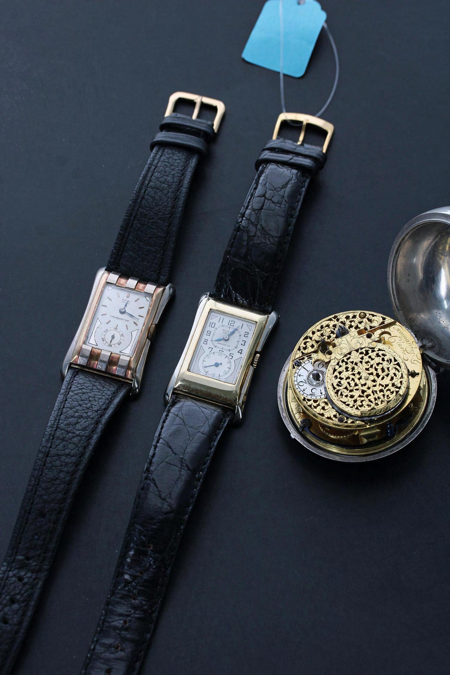 American Waltham 14k rolled gold lever hunter engine turned pocket watch, circa 1896, serial no. 8020898, 52mm; together with a Fleurier Watch Co. silver lever engine turned pocket watch, 49mm and a silver lever engine turned pocket watch, 58mm (3)