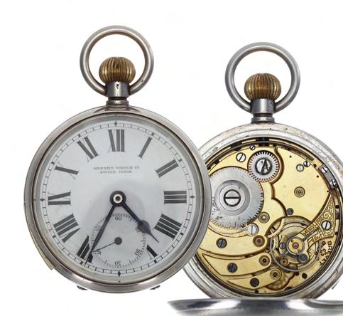 Nickel cased Goliath lever pocket watch, three quarter plate frosted movement with, Roman numeral dial, within a plain case, 65mm (dial at fault, lacking bow); together with a silver (800m) cylinder engine turned pocket watch, three quarter plate frosted movement, hinged cuvette inscribed 'Clerkenwell Watch COY, Holborn Viaduct, London', Roman numeral dial inscribed 'Clerkenwell Watch COY, London', 49mm (lacking bow, case with bruising) and a 'Superior Railway Timekeeper nickel cased engine turned pocket watch, 54mm (3)